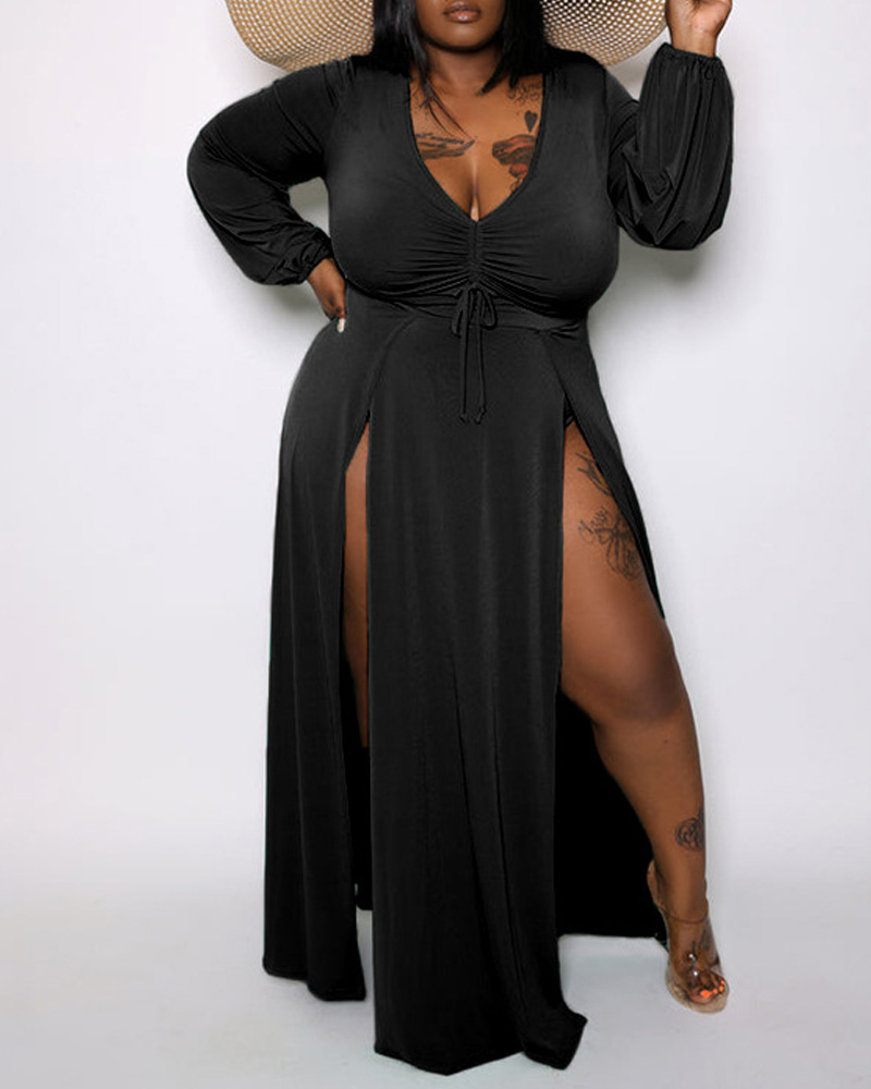 Plus Size Long Sleeve Drawstring Ruched High Slit Maxi Dress, Black