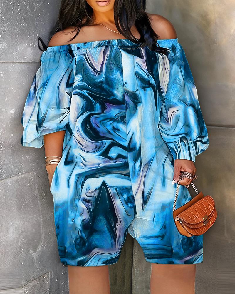 Plus Size Marble Print Off Shoulder Romper, Blue