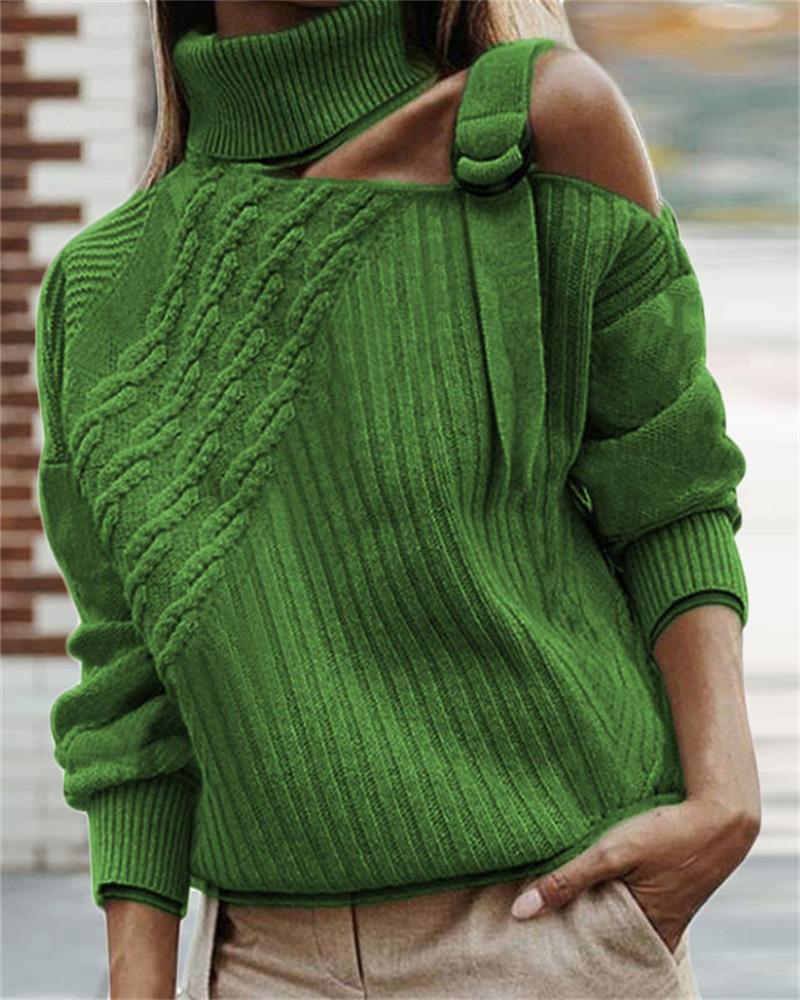 Plus Size O-Ring Cold Shoulder Cable Knit Sweater, Green