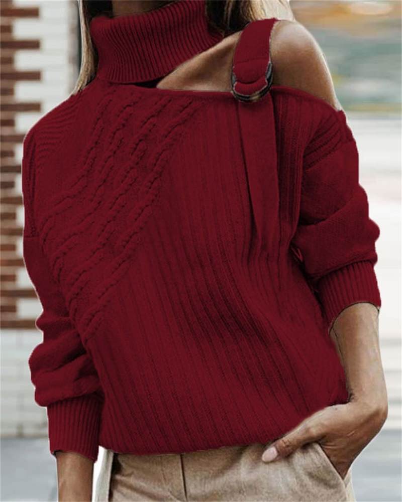 Plus Size O-Ring Cold Shoulder Cable Knit Sweater, Red