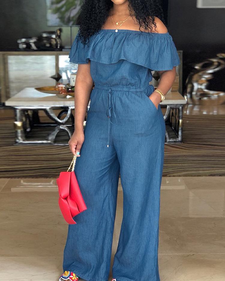 Plus Size Off Shoulder Drawstring Wide Leg Denim Jumpsuit, Blue