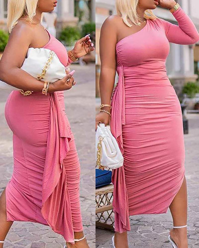 Plus Size One Shoulder Ruched Ruffles Sit Bodycon Dress, Pink