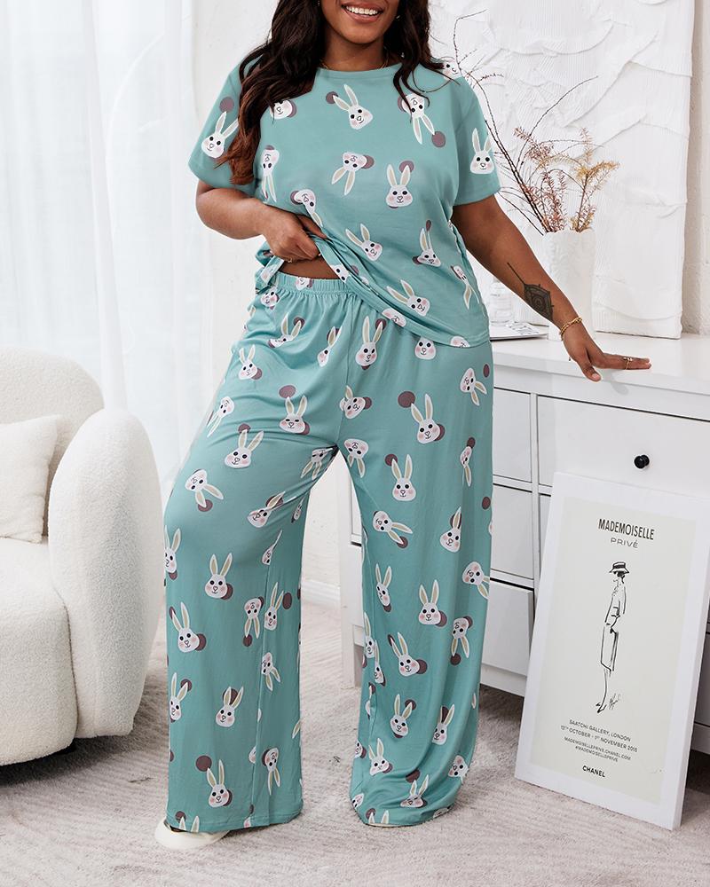 Plus Size Rabbit Print Short Sleeve Pajamas Set, Green