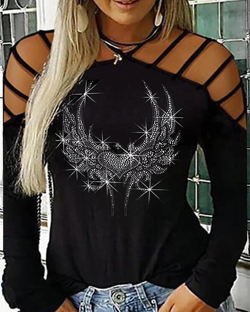 Plus Size Rhinestone Graphic Pattern Cold Shoulder Top, Black