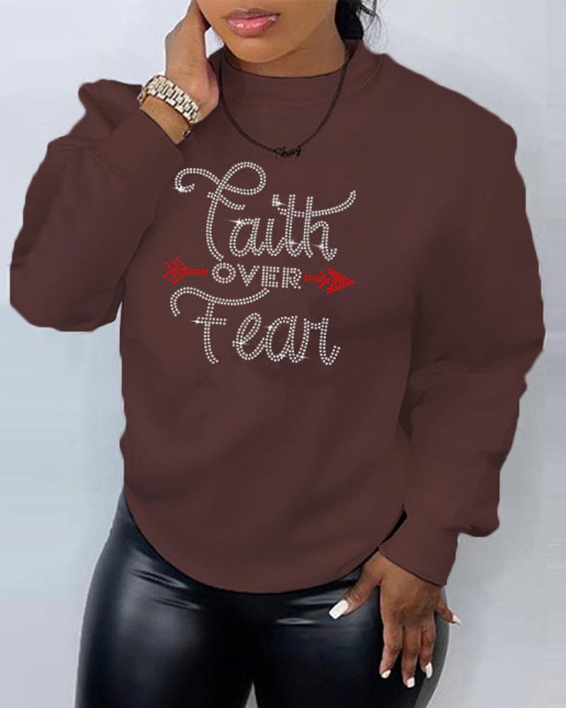 Plus Size Rhinestone Letter Pattern Long Sleeve Sweatshirt, Coffee