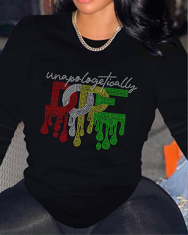 Plus Size Rhinestone Letter Pattern Long Sleeve Top, Black