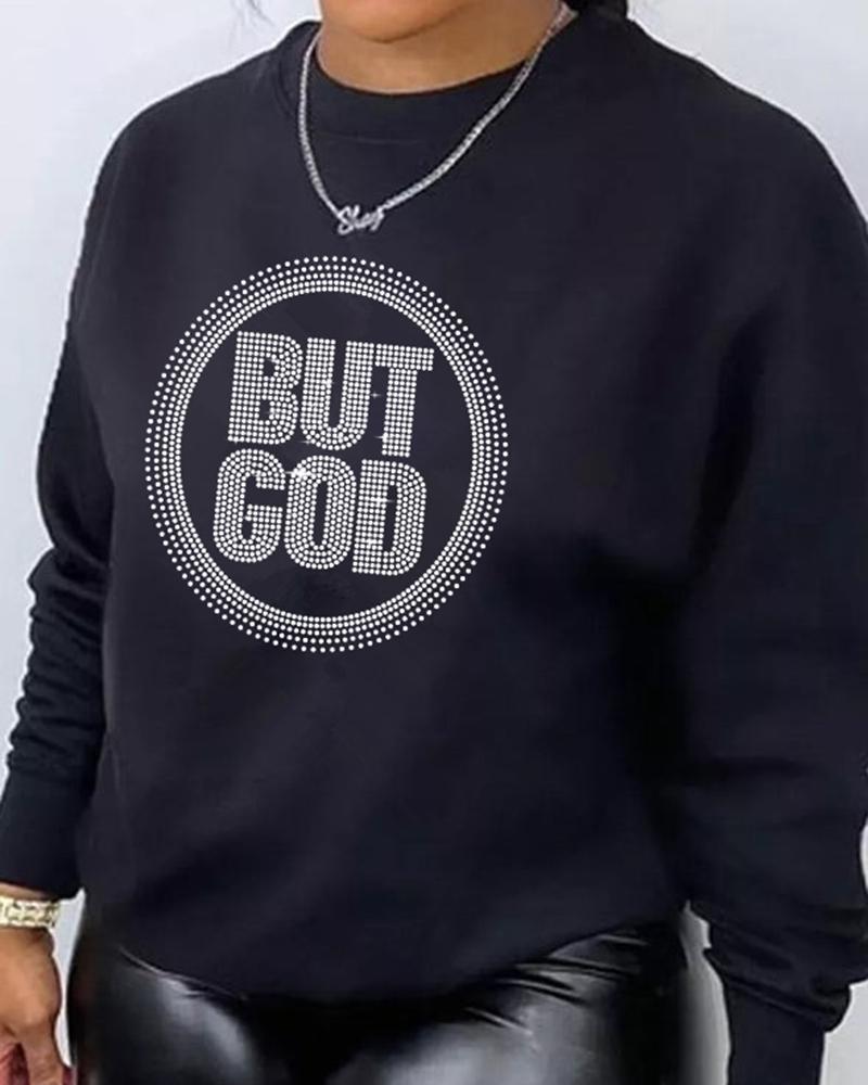 Plus Size Rhinestone Letter Pattern O-Neck Sweatshirt, Black
