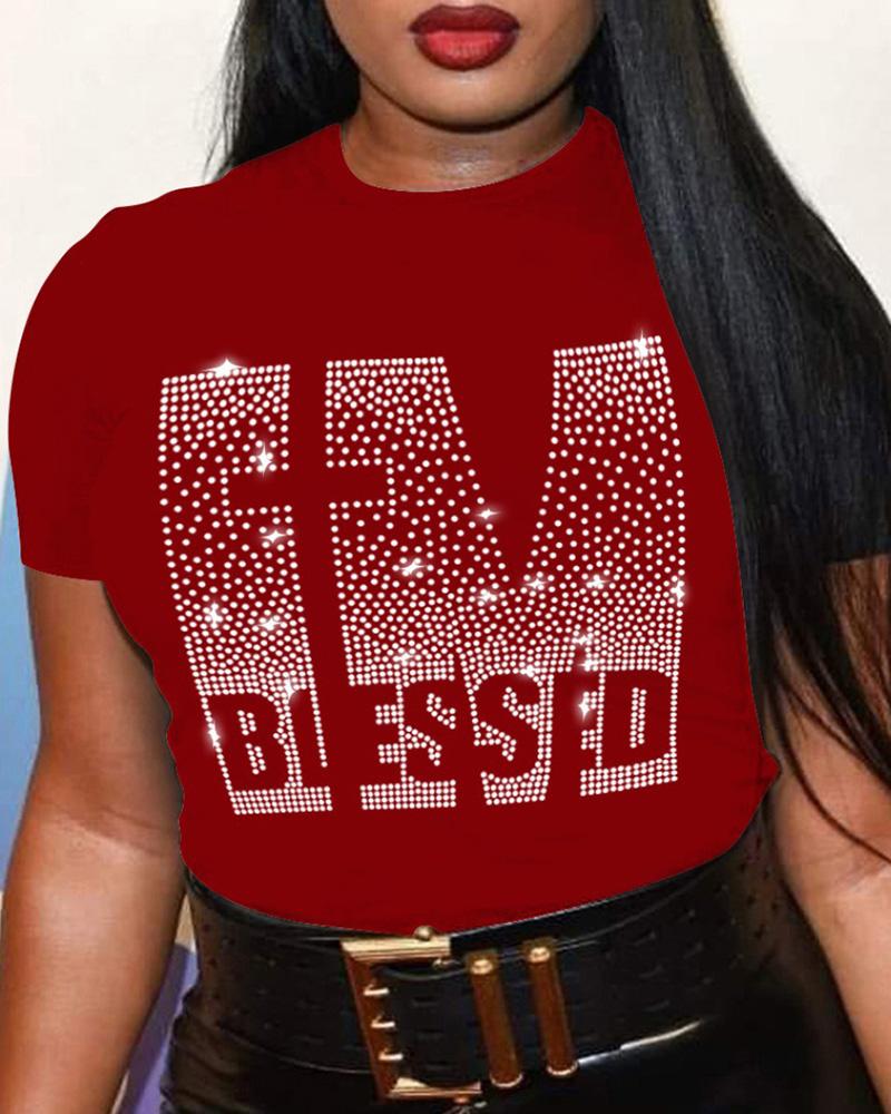 Plus Size Rhinestone Letter Pattern Short Sleeve T-shirt, Red