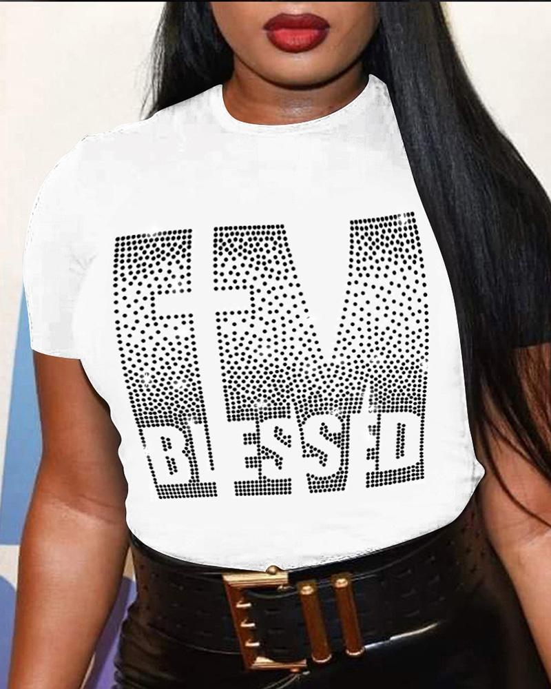 Plus Size Rhinestone Letter Pattern Short Sleeve T-shirt, White