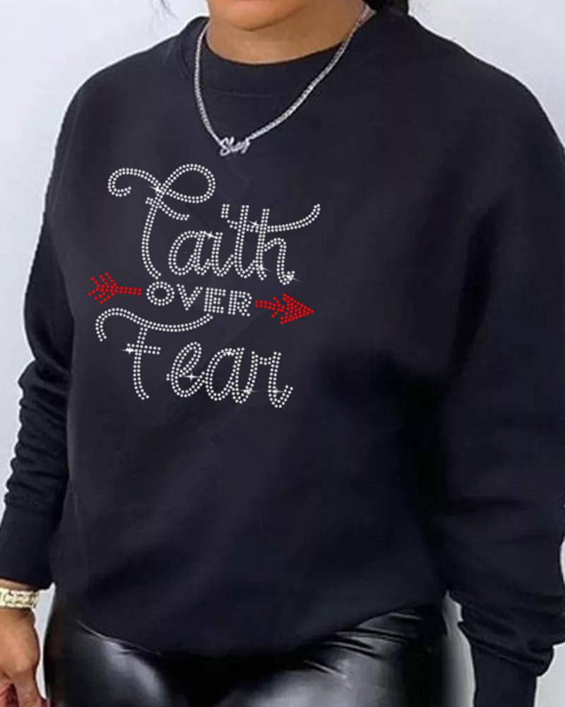 Plus Size Rhinestone Letter Pattern Sweatshirt, Black
