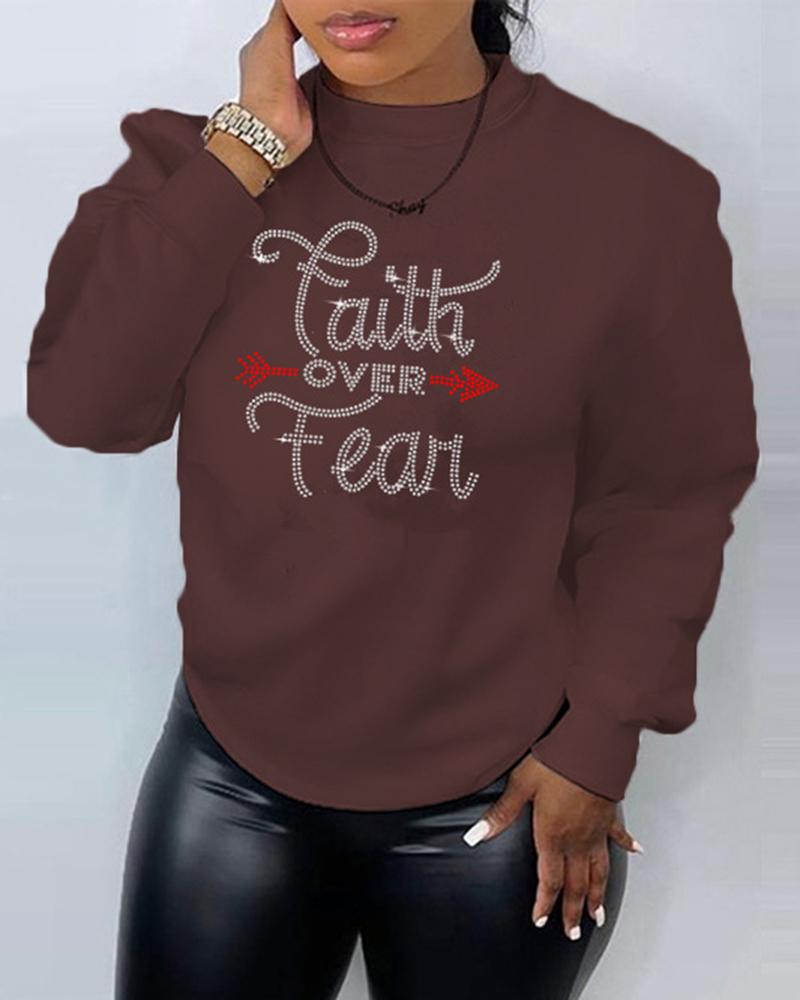 Plus Size Rhinestone Letter Pattern Sweatshirt, Brown