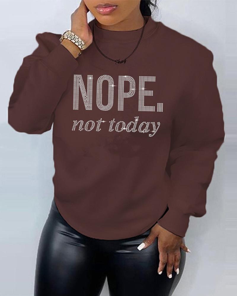 Plus Size Rhinestone Nope Not Today Funny Letter Pattern Sweatshirt, Brown