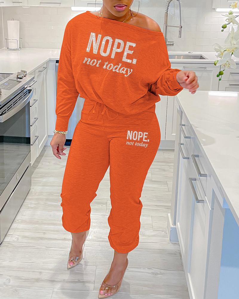 Plus Size Rhinestone Nope Not Today Pattern Top & Pants Set, Orange