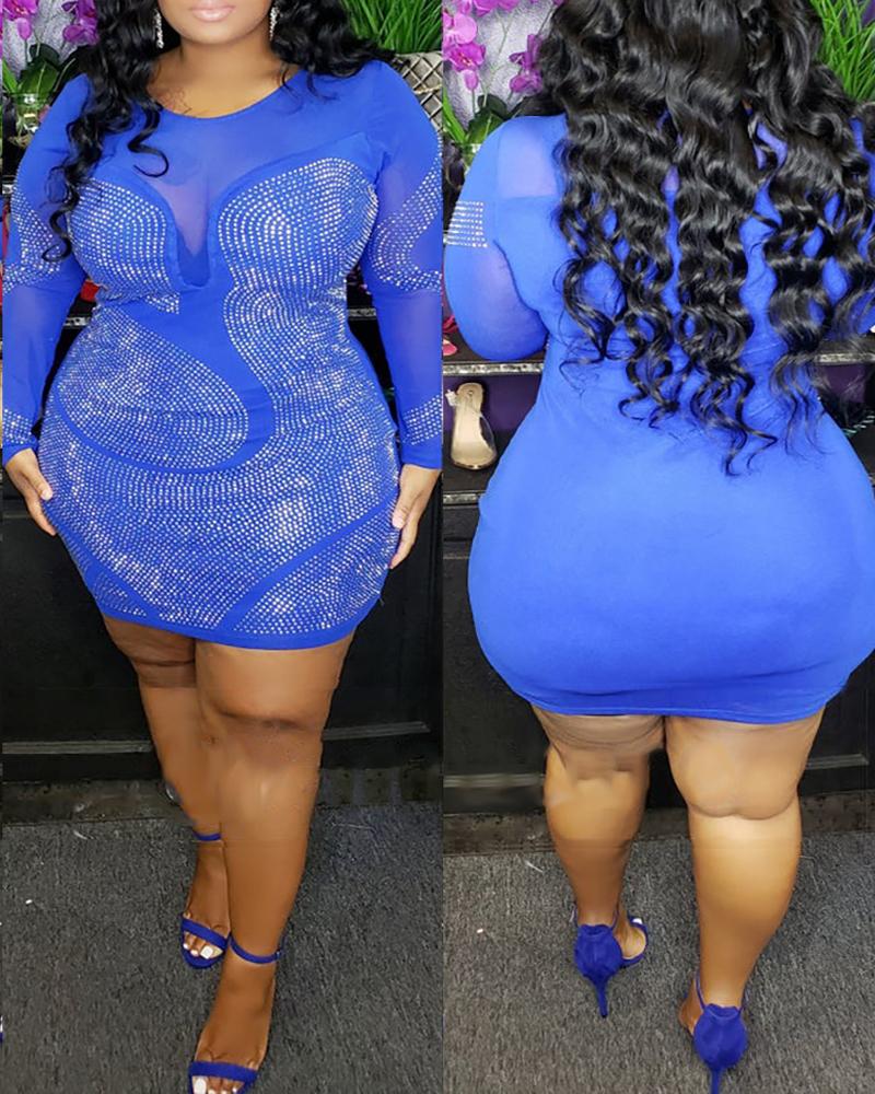 Plus Size Rhinestone Sheer Mesh Bodycon Dress, Blue