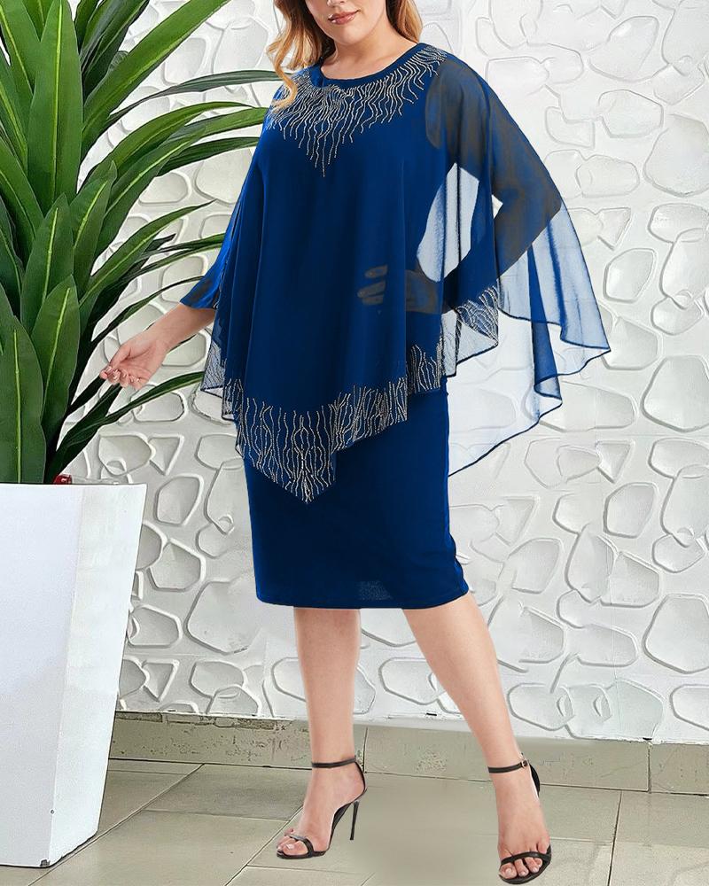 Plus Size Rhinestone Sheer Mesh Cloak Design Midi Dress, Blue