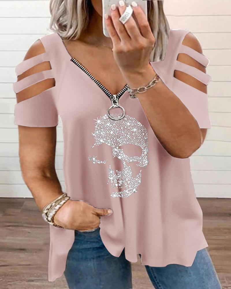 Plus Size Rhinestone Skull Pattern Cutout Zipper Design T-Shirt, Pink
