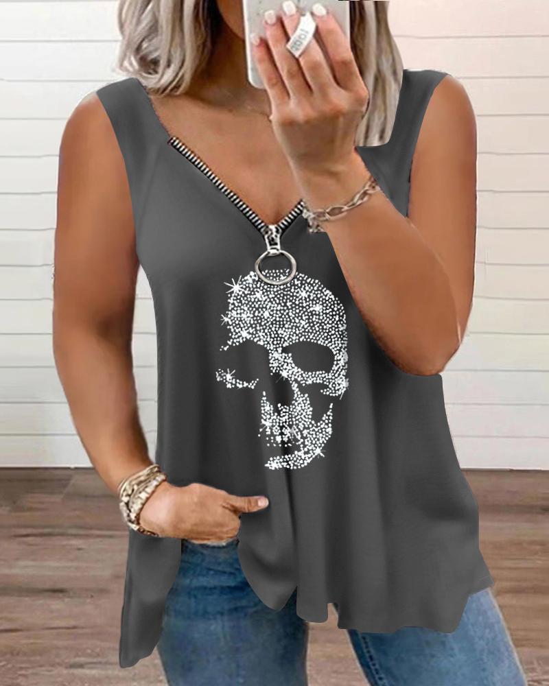 Plus Size Rhinestone Skull Pattern Zipper Design Tank Top, Gray