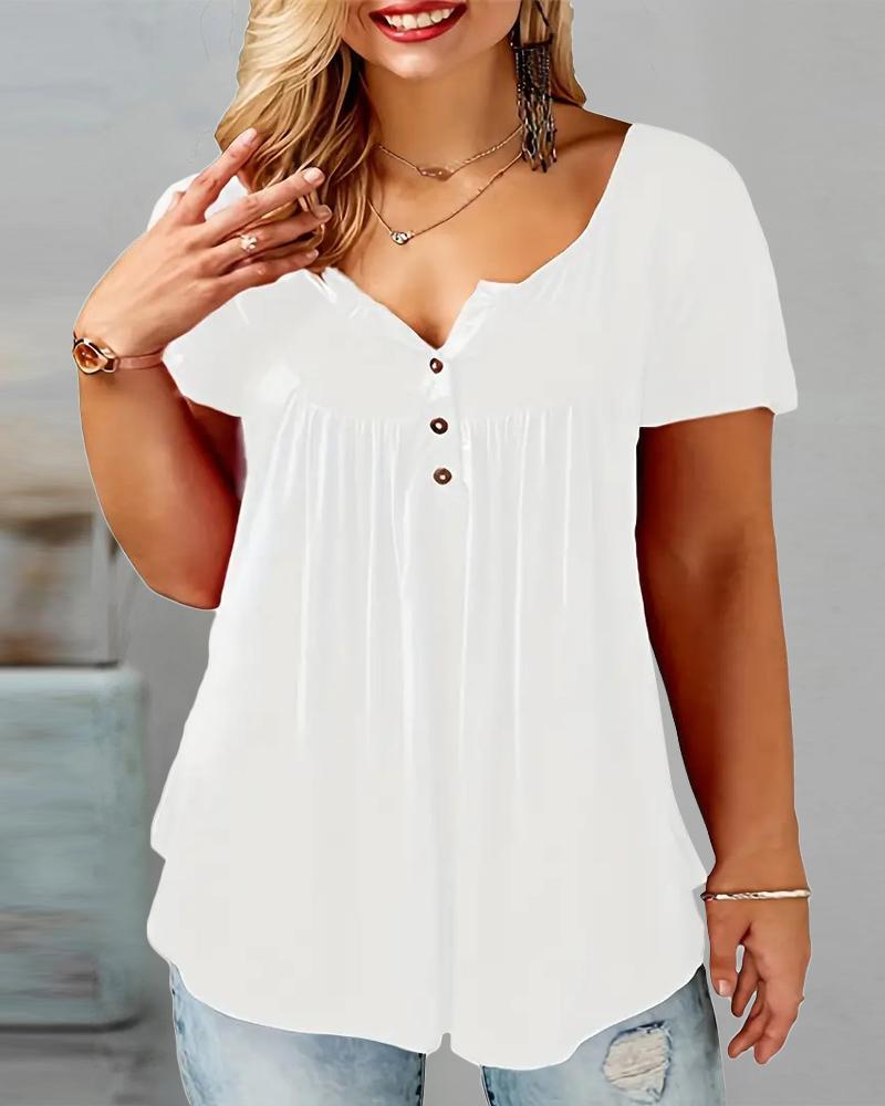 Plus Size Ruched Buttoned Short Sleeve Top, White