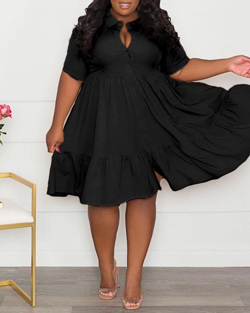 Plus Size Ruffle Hem Button Front Flowy Shirt Dress, Black