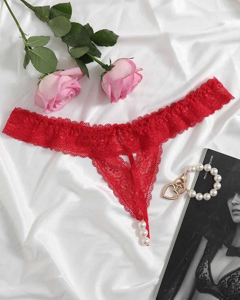 Plus Size Ruffle Hem Crochet Lace Beaded Panty, Red