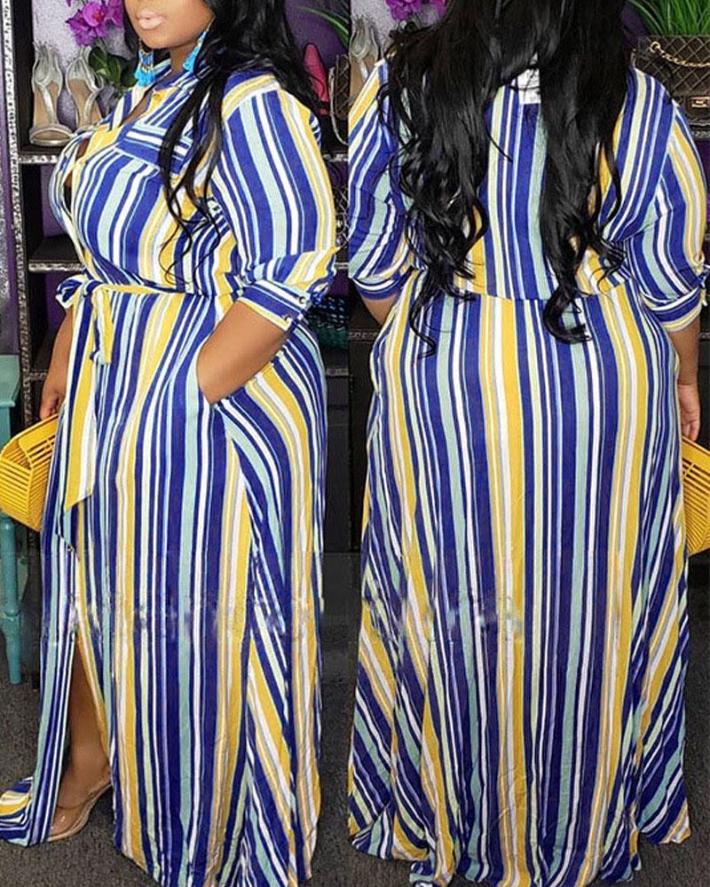 Plus Size Striped Print Button Down Shirt Dress, Dark blue