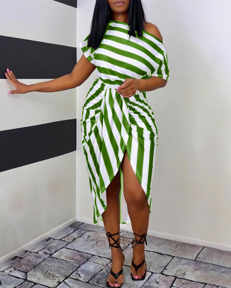 Plus Size Striped Print Ruched Split Work Dress, Green