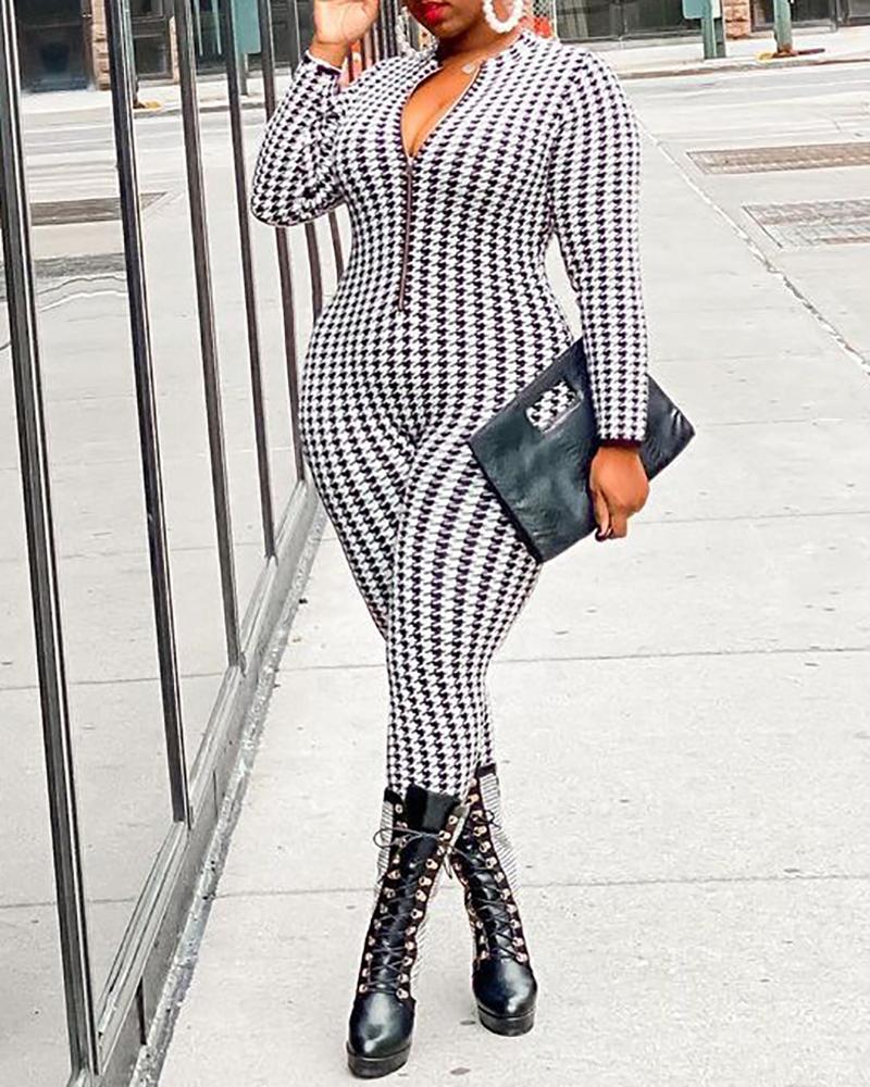 Plus Size Zipper Design Houndstooth Print Jumpsuit, White