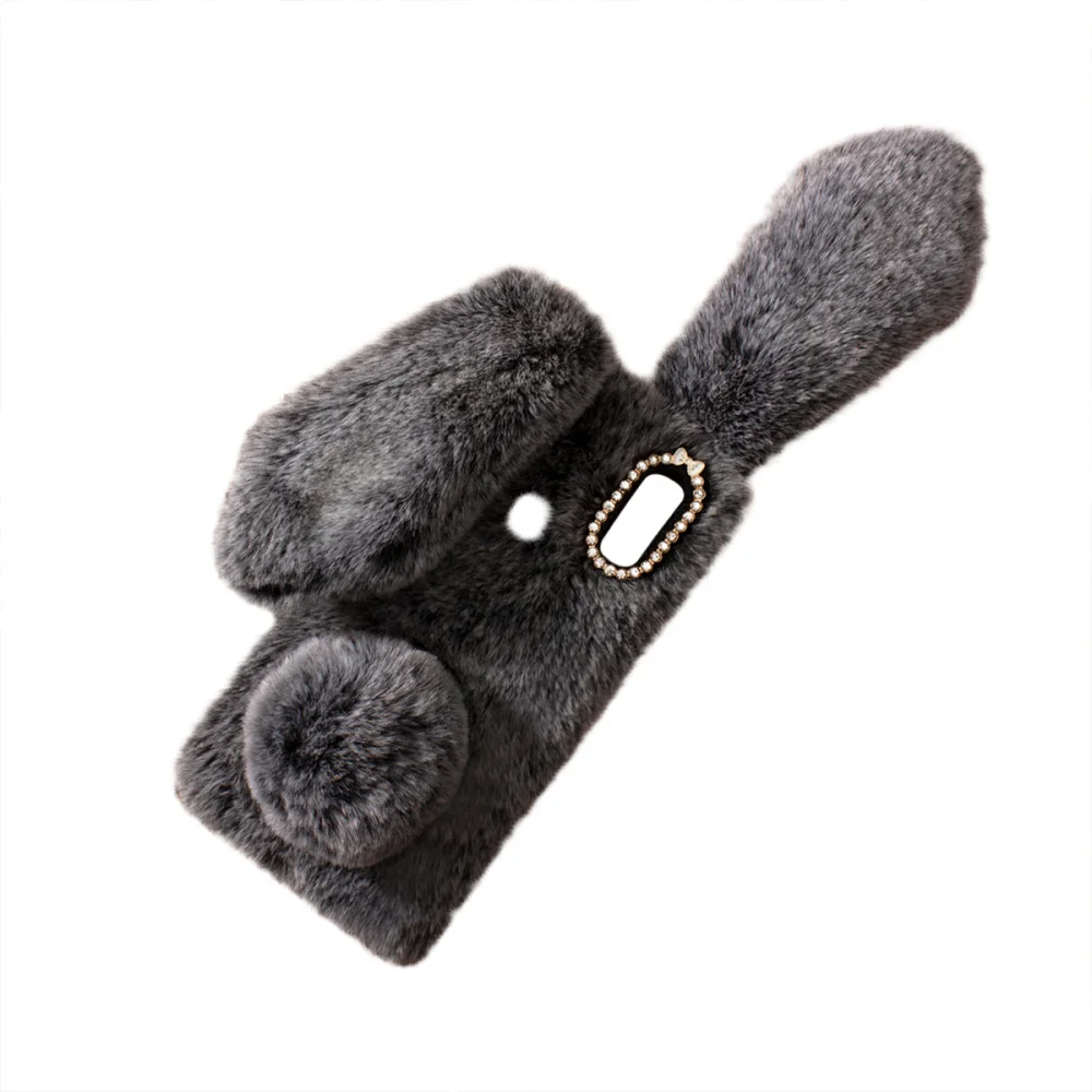 Plush Rabbit Design Phone Case Keep Warm Rhinestone Camera Frame Phone Shell Soft Shockproof Cover with Ear and Tail Compat