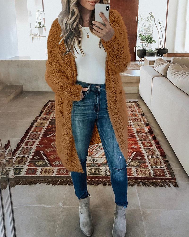 Pocket Design Long Sleeve Fluffy Knit Cardigan, Coffee