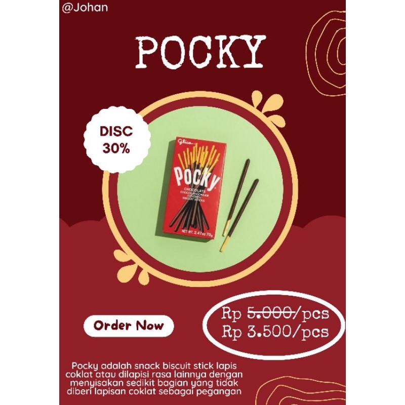 Pocky adalah snack biscuit stick lapis coklat atau dilapisi rasa lainnya dengan menyisakan sedikit bagian yang tidak diberi lapisan coklat sebagai pegangan.
