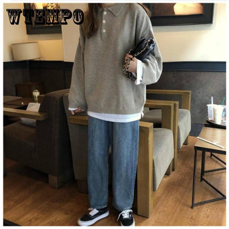 Pofulove Сплошной цвет POLO Воротник Свитер Куртка Женская Осень Зима Колледж Стиль Свитер