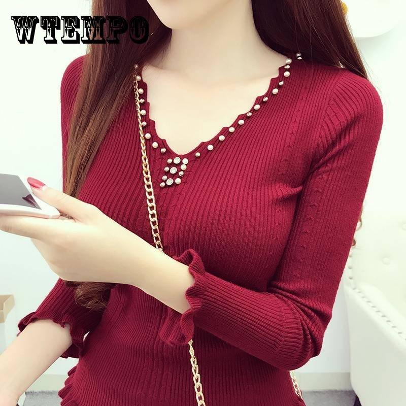 Pofulove осенне-зимняя милая вязаная нижняя рубашка с v-образным вырезом и бисером, тонкий пуловер