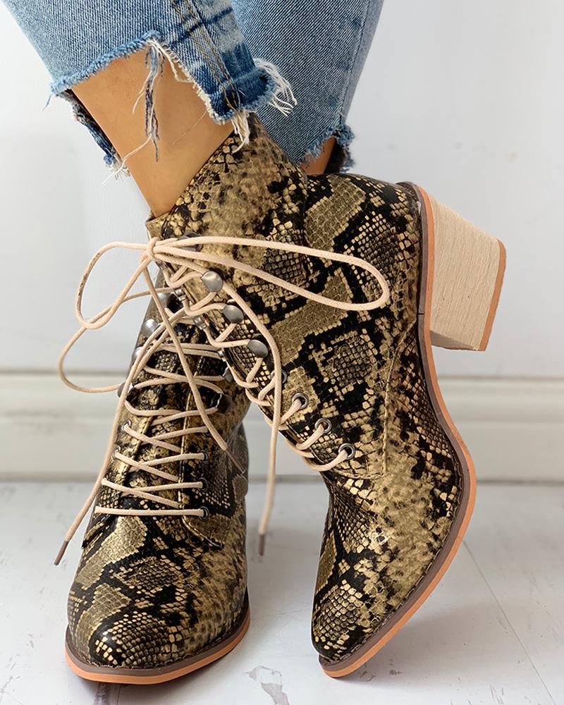 Pointed Toe Lace-up Snakeskin Chunky Heeled Boots, Yellow