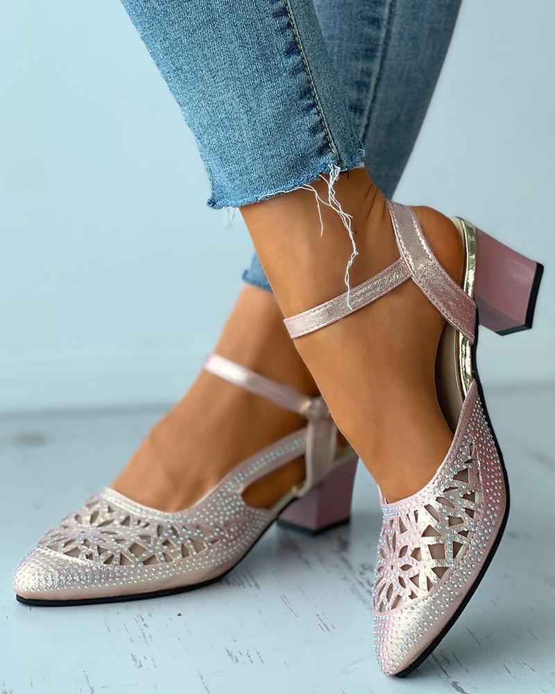 Pointed Toe Rhinestone Cutout Chunky Heels, Gold