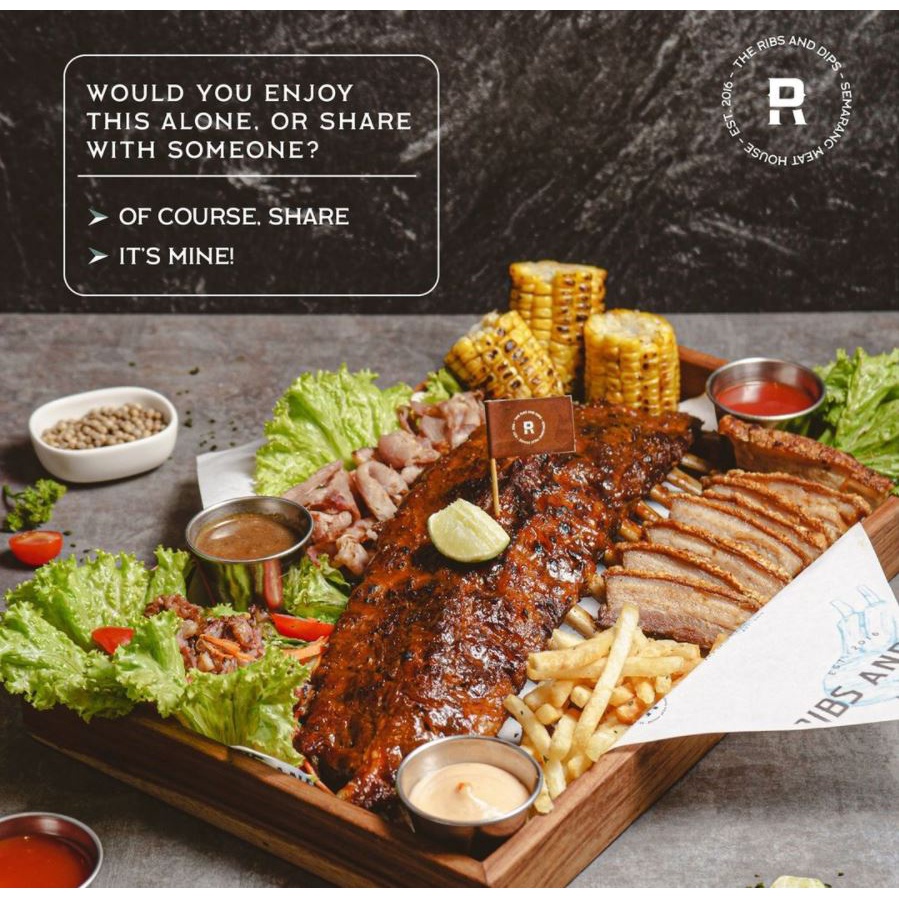 1 whole Rack Pork Ribs (BBQ/Spicy BBQ/Honey Garlic/ Charsiu) didampingi dengan Crispy Pork Belly, Smoked Ham, Smoked bacon Salad, French fries, Grilled Corn & 3 Saos (BBQ, Honey Ham & Creamy Mushroom)