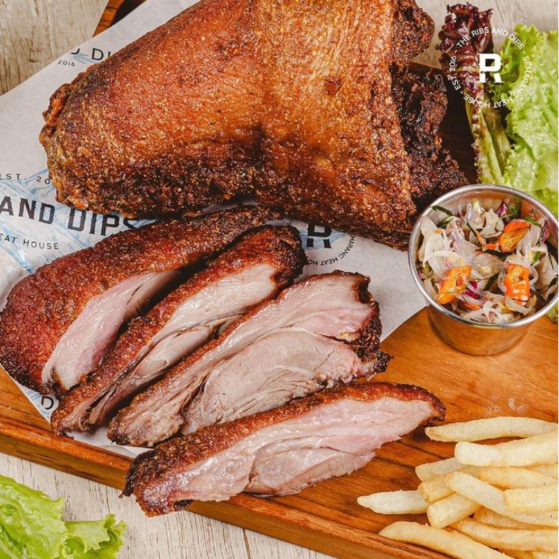 Pork knuckle (matang, siap makan) disajikan dengan French Fries, sauce BBQ & Beer Glaze Sauce, dikemas dalam Paper box ukuran 29x19x10 dan di beri Belt Happy Birthday / Special day. Cocok untuk hantaran.
