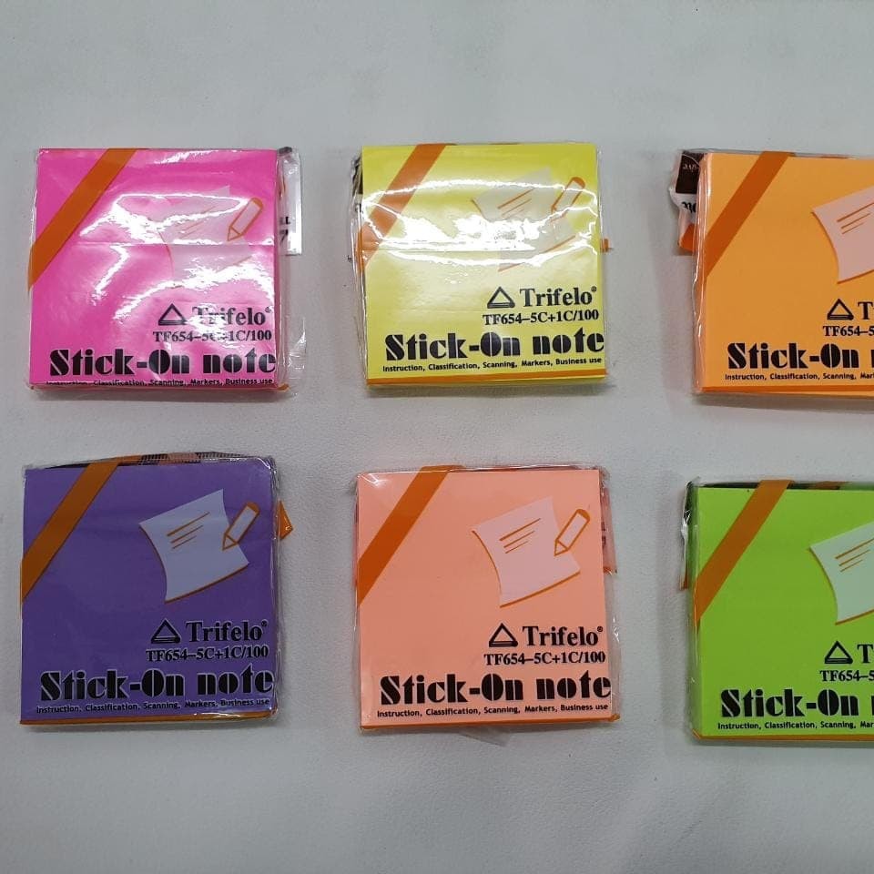 Stick Note / Post it Trifelo TF-654-5C Isi +- 100 lembar. Tersedia 6 warna : - Kuning- Pink- Ungu- Peach- Hijau Stabilo- Orange