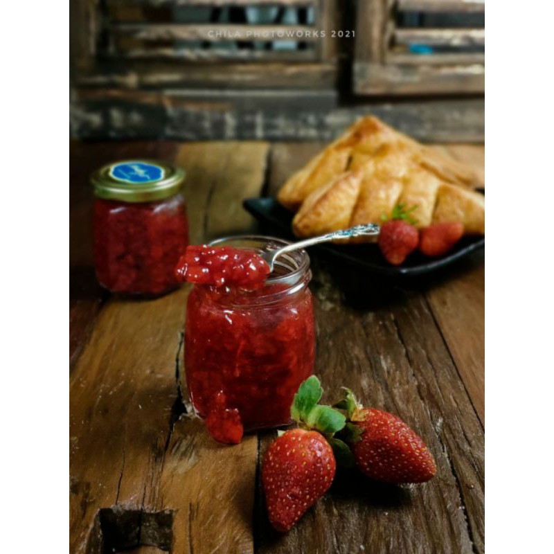 Selai Strawberry dengan potongan buah segar.