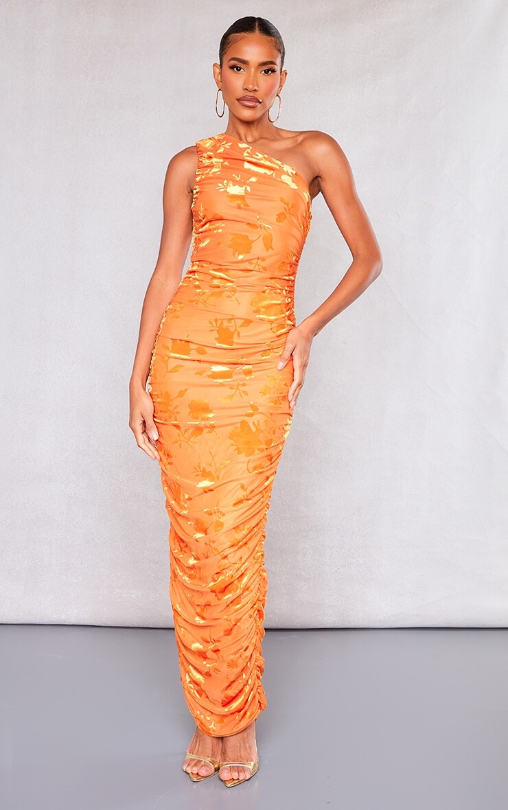 PrettyLittleThing Оранжевое платье макси на одно плечо Devore со сборками и цветочным принтом
