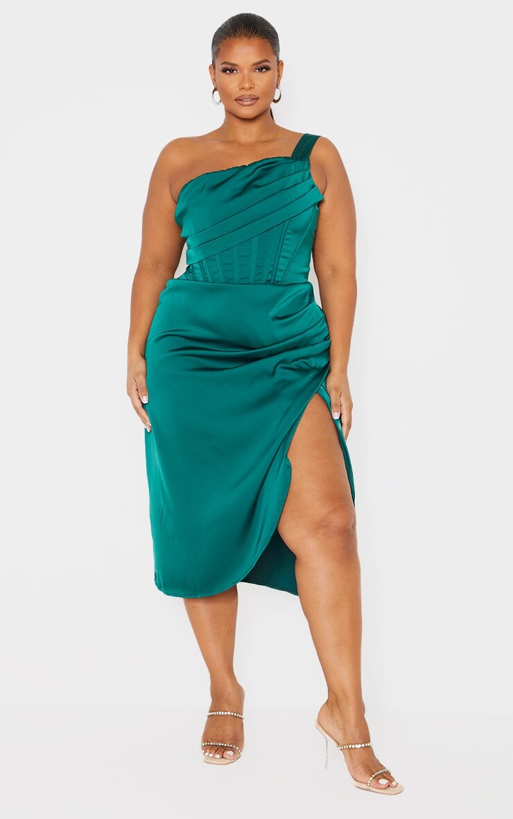 PrettyLittleThing Плюс Изумрудно-зеленое атласное платье миди с драпировкой и разрезом по бокам, Зеленый, PrettyLittleThing Плюс Изумрудно-зеленое атласное платье миди с драпировкой и разрезом по бокам