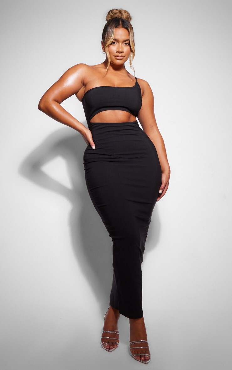 PrettyLittleThing Черное эластичное тканое платье мидакси на одно плечо с вырезом