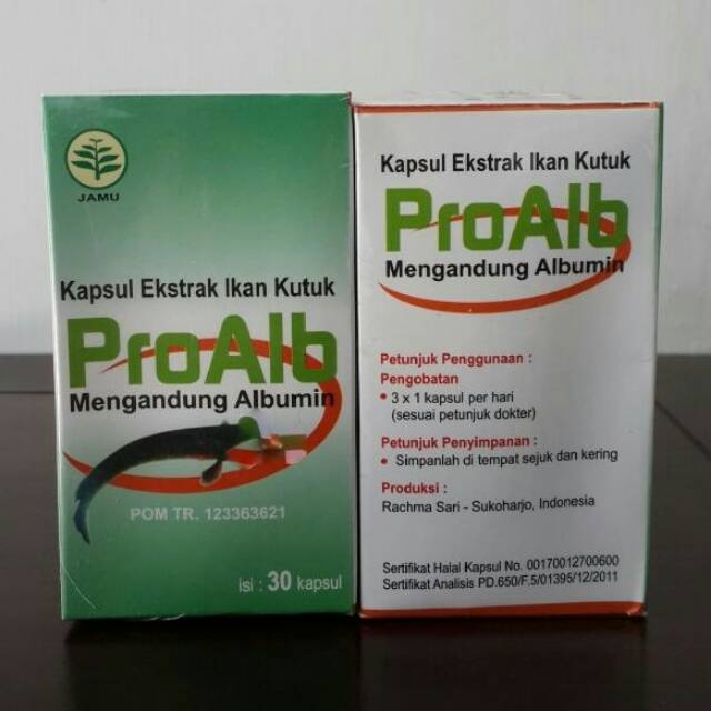 PROALB (KAPSUL IKAN KUTUK) Ikan gabus memilki kandungan protein albumin lebih tinggi dibandingkan dengan ikan-ikan yang lain (ikan lele, ikan bandeng, ikan mas dan lainnya), dan lebih tinggi pula dibandingkan bahan pangan yang telah kita kenal sebagai sumber protein seperti telur, daging ayam, dan daging sapi. Per 100 gramnya ikan gabus memiliki kadar protein sebesar 25,2 gram jauh lebih besar dibandingkan dengan sumber protein lainnya. Manfaat ikan kutuk (Channa striata) - Mempercepat penyembuhan luka (luka khitan, luka sehabis melahirkan, sehabis operasi, luka bakar dan lainnya. - Membangun dan memperbaiki jaringan sel yangmati (termasuk pada luka diabetes melitus, jaringan kullit yang mati. - Sebagai antioedema/pembengkakan pada kaki akibat kekurangan albumin dalam tubuh. (biasanya untuk penderita stroke, TBC, dan kanker sirosis. - Untuk membantu pertumbuhan dan perkembangan anak-anak, dan memperbaiki sel organ yang aus (rusak) pada orang tua.