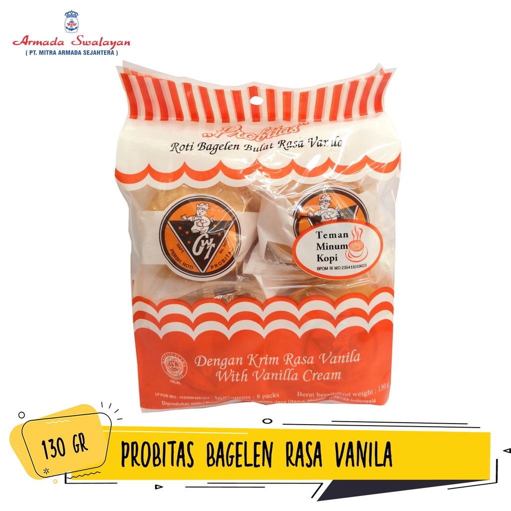 Probitas Bagelan Rasa Vanila merupakan roti bagelan dengan krim rasa vanila renyah yang dikemas praktis untuk menemani waktu kumpul dan santai bersama teman dan keluarga. Terbuat dari bahan-bahan pilihan berkualitas dan diolah secara higienis dan modern sehingga menghasilkan roti bagelan yang terjamin kualitas dan rasanya. Kerenyahan dan rasa biskuit yang lezat membuat Probitas Bagelan Rasa Vanila ideal untuk dijadikan teman camilan dan penghangat suasana kumpul Anda.