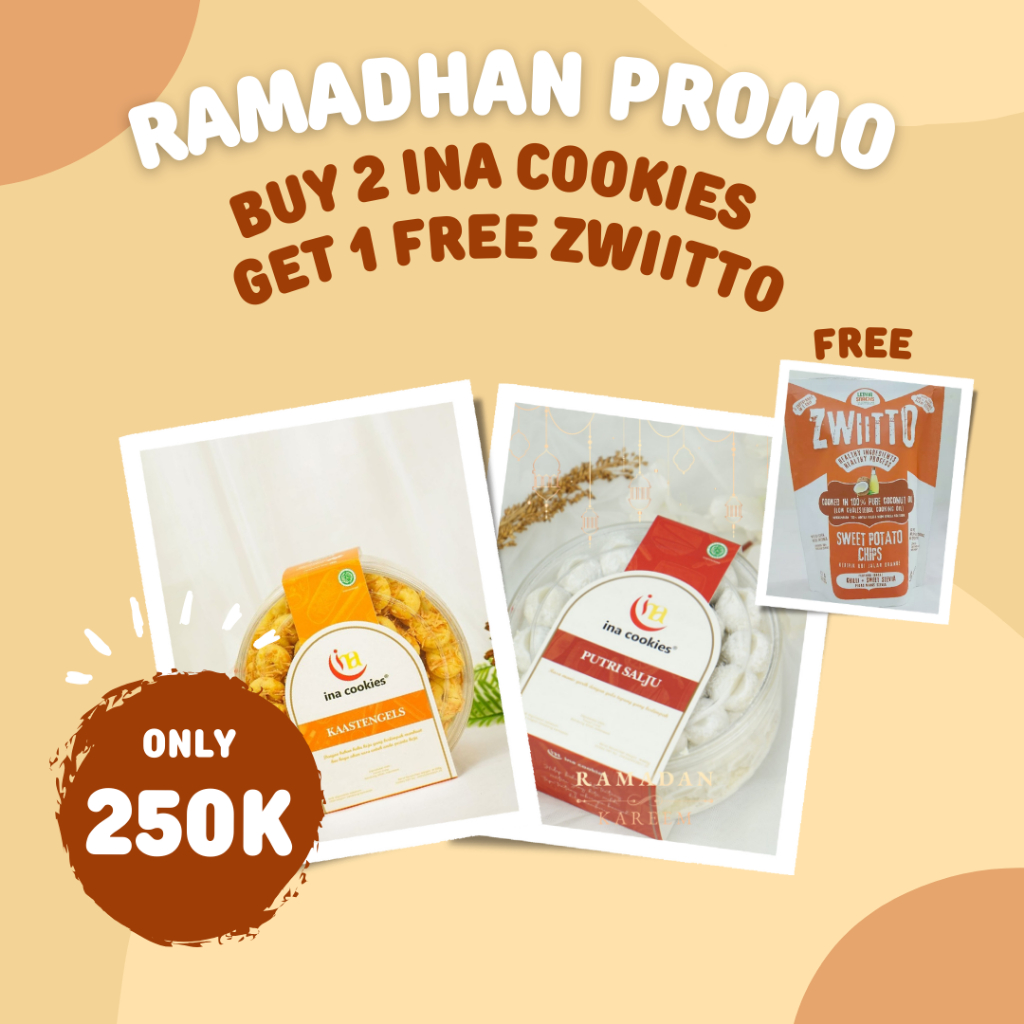 Setiap pembelian produk Ina Cookies toples Reguler (berat kurang lebih 500 gram, berat berbeda sesuai varian), akan mendapatkan 1 pouch Zwiitto Keripik Ubi Jalar Orange (Healthy Snack 47gram).