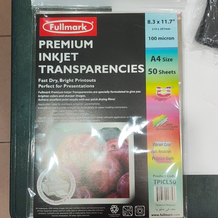 Deskripsi Transparencies - Fullmark inkjet Tranparencies A4 Transparencies - Fullmark Inkjet Transparencies A4 100 micron 50 sheets 210x293mm (8.3 #34; x 11.7 #34;) TPICL50