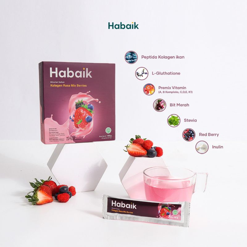 Habaik Beauty Drink. Minuman serbuk kolagen rasa mix berries untuk membantu mencerahkan, melembapkan dan meningkatkan elastisitas kulit. Serta berfungsi sebagai antioksidan.