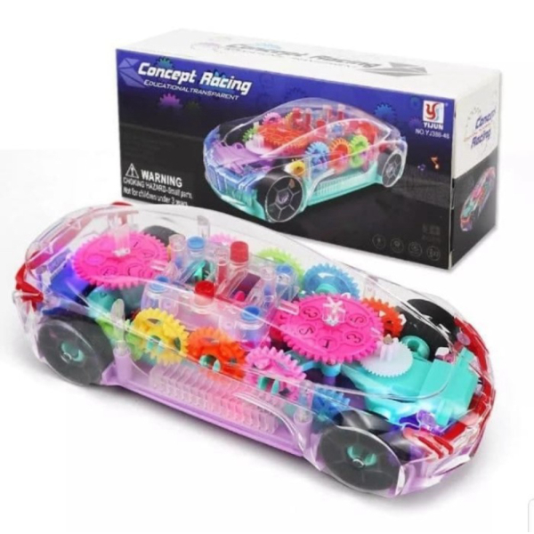 Mobil mobilan transparan yang berisi gear. Gear dapat berjalan ketika mobil berjalan. Mobil di lengkapi lampu dan musik, menambah seru ketika bermain.