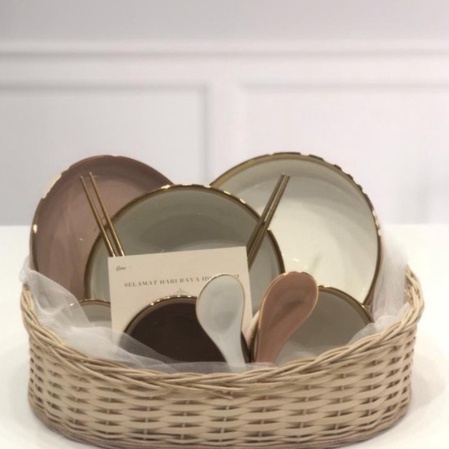 Promo Luxury Plate Dinnerware Gift Set 11pcs/ Parcel Piring Mewah Unik Gold - Merah Muda Berkualitas