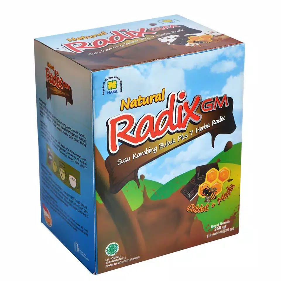 Susu kambing murni Natural Radix GM tersedia dalam 2 pilihan rasa yaitu Madu dan Cokelat Madu. Susu Natural Radix GM dapat dikonsumsi oleh semua anggota keluarga untuk menjaga kesehatan.