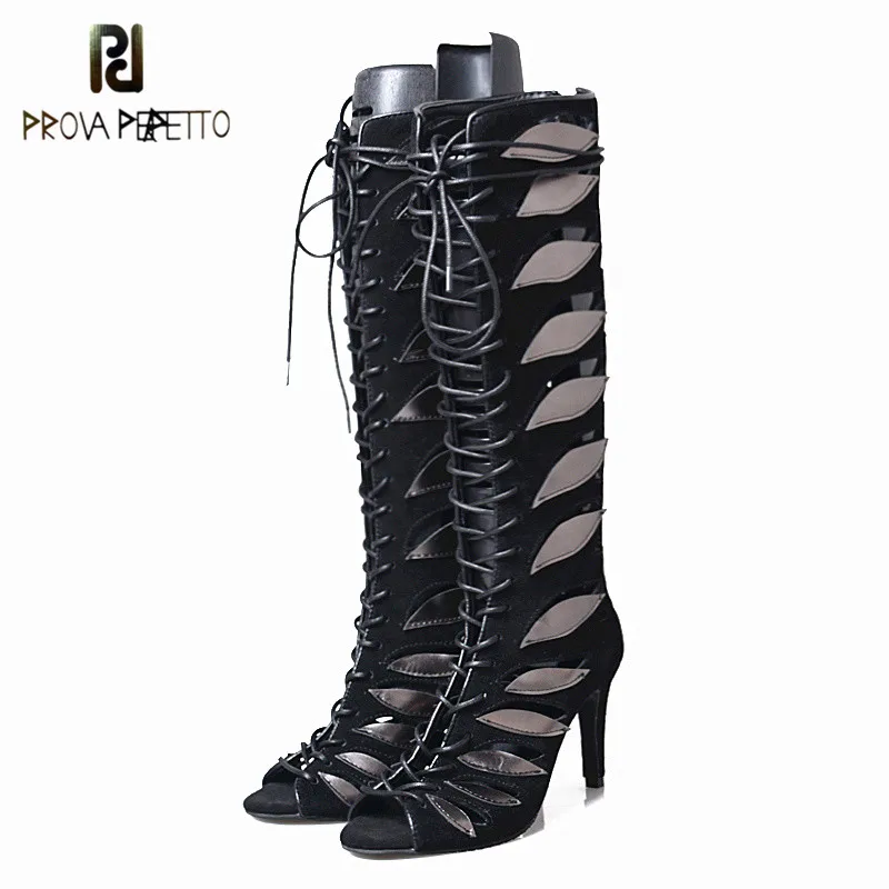 Prova Perfetto Fashion Hollow Out Mixed Color Sandals Boots Petals Design Suede Leather High Heels Boot Peep Toe Lace Up Sandals